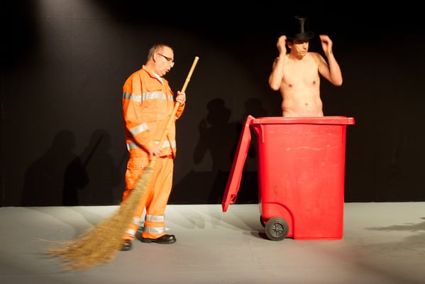 nackten Liebesflüchtlings, der sich seiner Nacktheit bewusst, in einer Mülltonne versteckt.