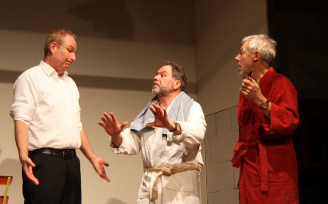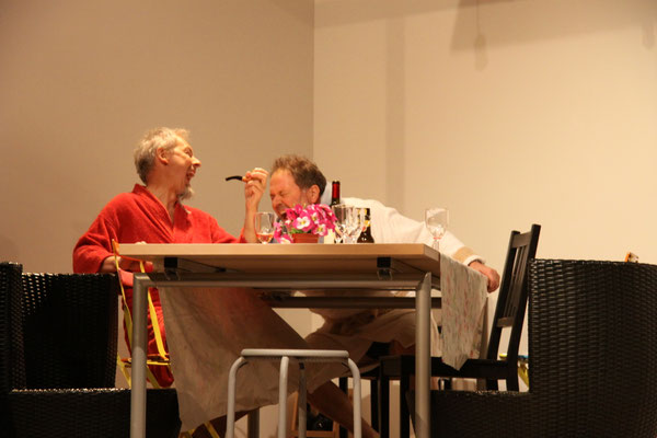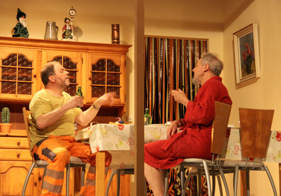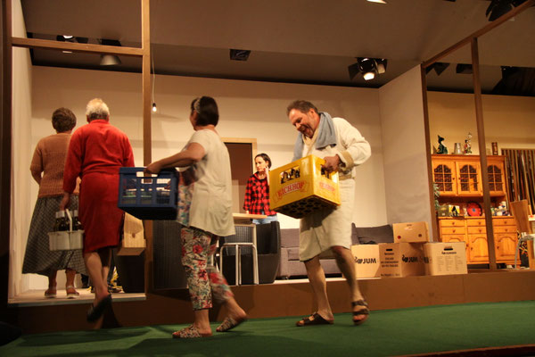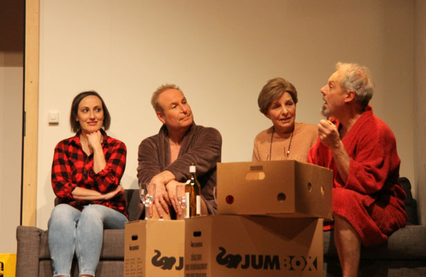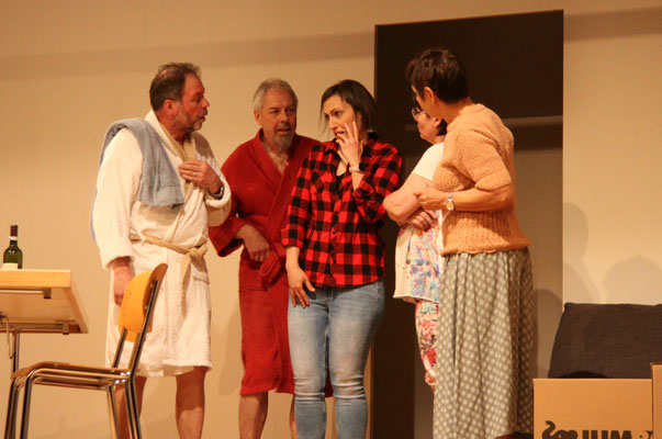 Zwischen gemeinsamen Saunabesuchen und gescheiterten Experimenten am Sicherungskasten nimmt der Abend immer schrägere Züge an. Spätestens nach dem dritten Glas Wein erfährt das Publikum, dass die Bewohnerinnen und Bewohner des Reihenhauses mehr als nur ein unschönes Geheimnis mit sich tragen. Da scheint Knapp-Sohn Christoph noch der angenehmste Zeitgenosse zu sein. Dieser freundet sich mit der neuen Nachbarstochter Isa an, während bei den «Alten» langsam aber sicher das Chaos ausbricht.